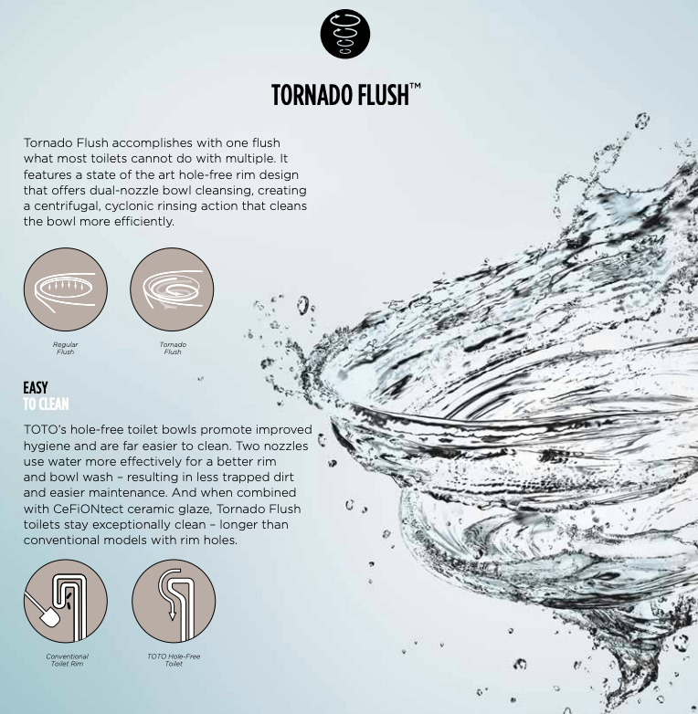 • DYNAMAX TORNADO FLUSH®: Efficient 1.0 GPF system with powerful 360° bowl cleaning.