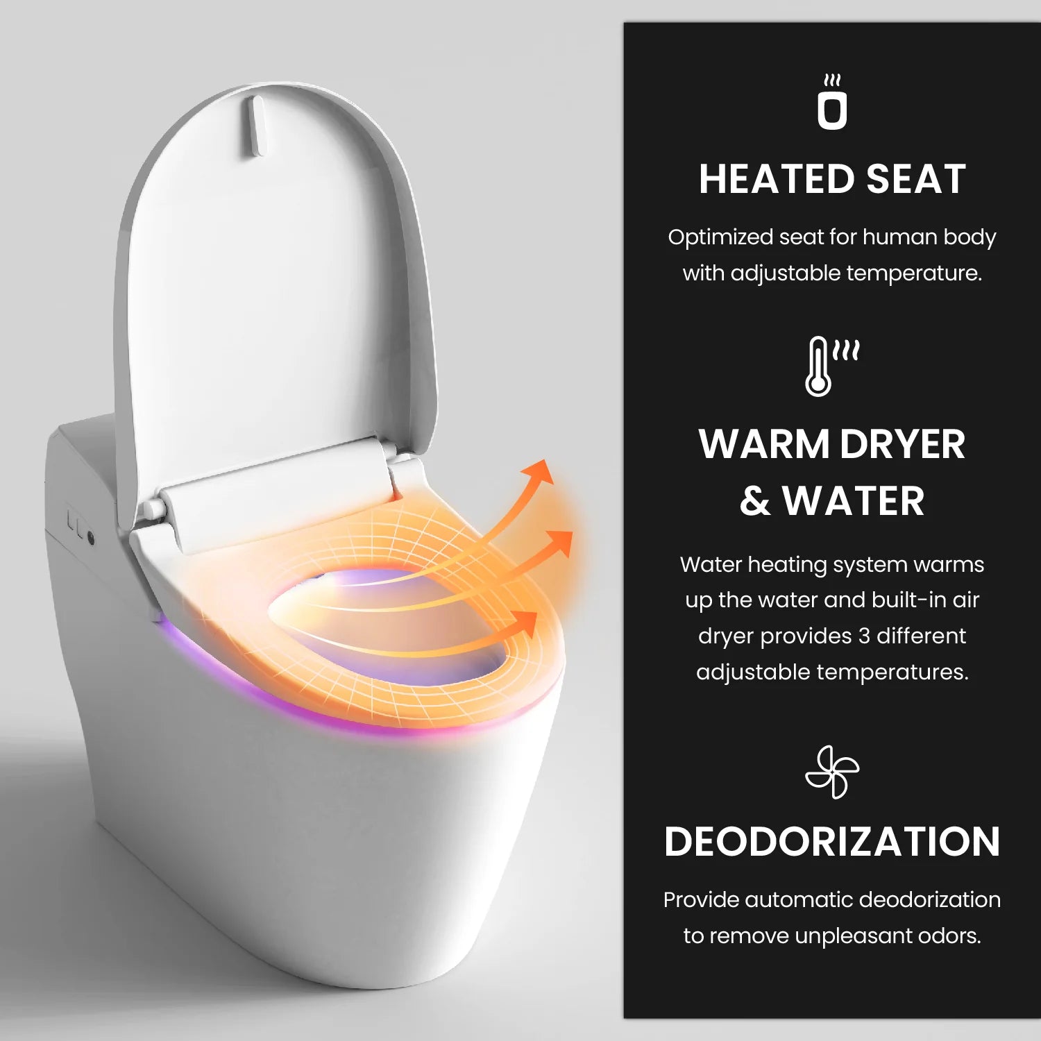 • Auto Deodorization: Neutralizes odors automatically for a fresher bathroom experience.