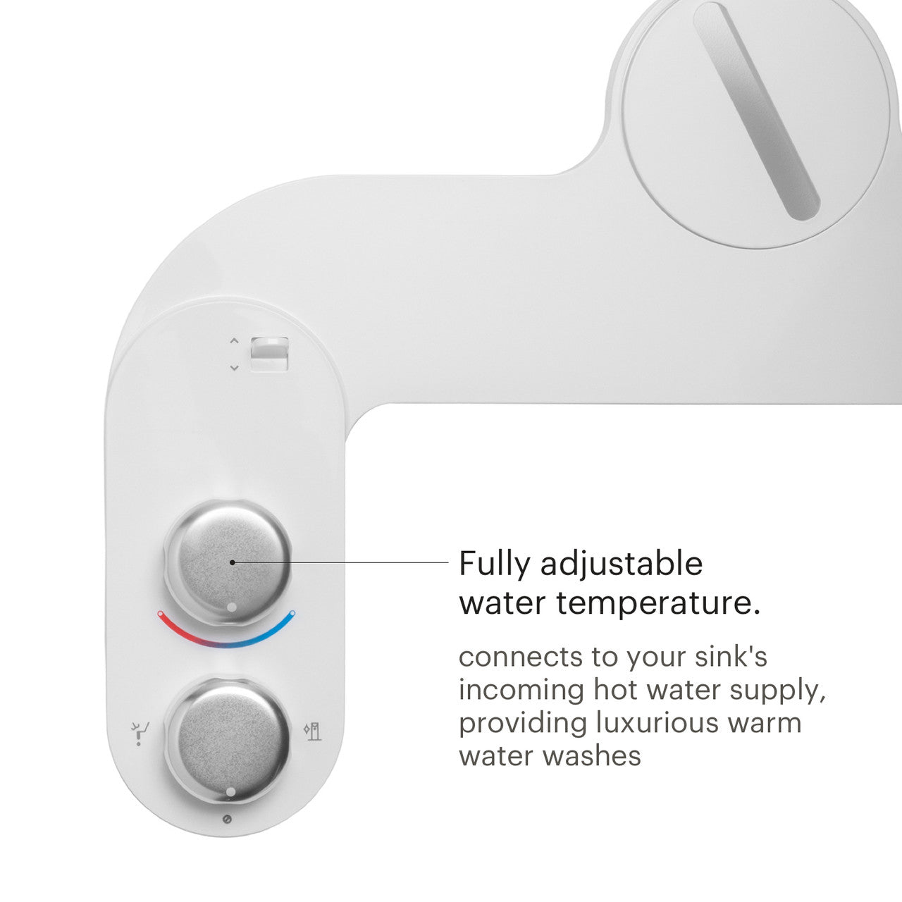 Brondell's SimpleSpa Eco Advanced Bidet Attachment provides luxurious warm and cool water washes. For warm water, the bidet must be connected to your sink’s hot water supply line using the provided high-temperature hot water tubing. Hot water is blended with ambient temperature water from your toilet’s clean water supply line to reach the preferred temperature for your wash. Temperature is controlled using the intuitive aluminum knobs on the convenient side-arm control panel.