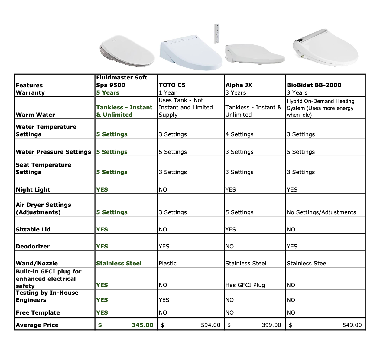 We are extremely happy with this bidet seat. We love that it has a cleaner and deodorizer. It has several adjustments for heat and water pressure. The night light is a fun addition.
